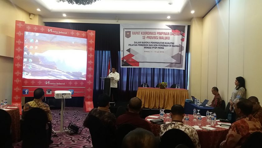 Ambon, indonesiatimur.co – Pemerintah terus berupaya menyederhanakan perizinan, berusaha dan menciptakan model pelayanan perizinan terintegrasi yang cepat dan murah serta memberi kepastian. Salah satunya, dengan meluncurkan Sistem Online Single Submission (OSS) dengan harapan mempermudah sistem perijinan untuk berusaha di Indonesia baik pusat maupun daerah. “Presiden Joko Widodo menginginkan bahwa Perijinan Terpadu Satu Pintu (PTSP) di seluruh Indonesia itu terintegrasi, agar pengurusan dokumen perijinan bisa diurus secara online dengan cepat dan mudah, dan tidak menjadi beban bagi perorangan maupun pihak swasta yang memohon ijin usaha. Karena itu, pemerintah sudah melaunching sistem OSS,” demikian disampaikan Staf Ahli Menteri Dalam Negeri RI, Bidang Pemerintahan, Suhajar Diantoro, kepada pers usai menghadiri Rapat Koordinasi Pimpinan Daerah dalam rangka Asistensi Penyelenggaraan PTSP Prima di Daerah yang diselenggarakan oleh Dinas Penanaman Modal dan PTSP di Swissbel Hotel, Kamis (12/6).