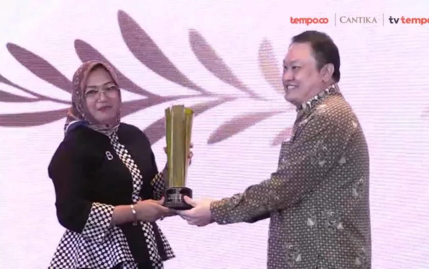 Safitri Malik Soulisa, menerima penghargaan Kategori Inovasi Aksesibilitas Kesehatan. Tropi di serahkan oleh Direktur PT Tempo Media Group, Bastian.