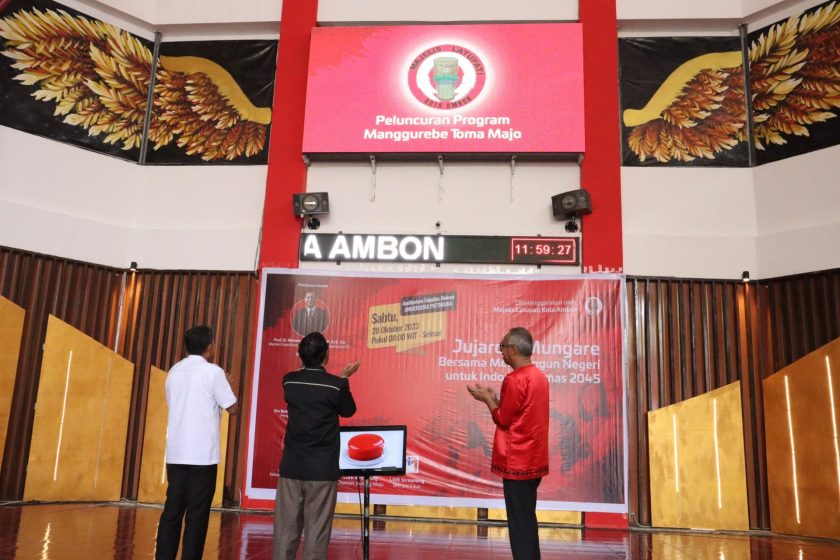Peluncuran Program Manggurebe Toma Majo ditandai dengan peletakan tangan pada screen monitor yang dilkakukan secara bersama-sama oleh Menteri Koordinator Bidang Politik, Hukum, dan Keamanan (Menko Polhukam), Mahfud MD, Penjabat Wali Kota Ambon, Bodewin M Wattimena, dan Ketua Latupati Kota Ambon, Reza Valdo Maspaitella. (it-02)