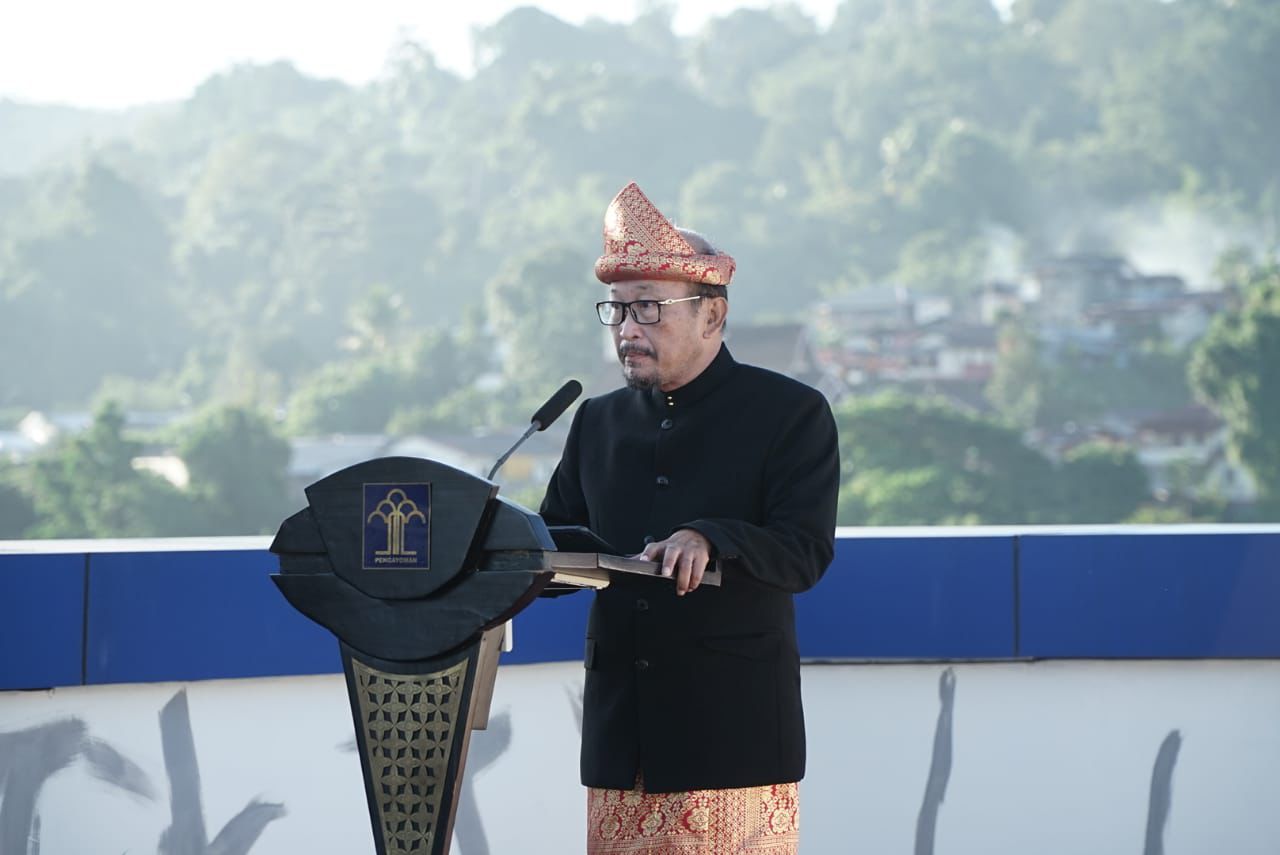 Pelaksanaan upacara bendera peringatan Hari Lahir Pancasila kali ini semakin semarak dengan penggunaan pakaian adat oleh seluruh peserta upacara. Hendro Tri Prasetyo, selaku Inspektur Upacara, tampak gagah dalam balutan baju adat Sumatera Selatan. Sementara itu, para peserta upacara lainnya mengenakan berbagai macam pakaian adat nasional dari berbagai daerah di Indonesia. Perpaduan warna dan corak yang beragam ini secara visual merepresentasikan semangat Bhinneka Tunggal Ika, salah satu nilai luhur yang terkandung dalam Pancasila. (it-02)