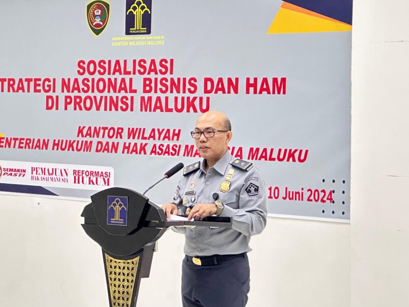Ambon, indonesiatimur.co – Dalam upaya meningkatkan pemahaman dan komitmen para pemangku kepentingan dalam mengintegrasikan prinsip-prinsip Hak Asasi Manusia (HAM) dalam dunia usaha, Kanwil Kemenkumham Maluku menggelar Sosialisasi Strategi Nasional Bisnis dan HAM bertempat di Aula lt.4 Kantor Wilayah, Senin (10/06/2024)