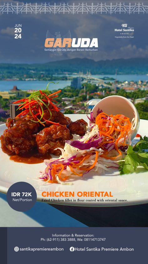 Menurutnya, selama bulan Juni, Hotel Santika Premiere Ambon menghadirkan promo menu istimewa mulai dari Chicken Oriental disajikan dengan Ayam dan saus oriental dengan harga Rp 72.000nett/porsi, dan juga Ayam Kintami yaitu grilled chicken, yang disajikan dengan special saus dengan nasi dan sayur dengan harga Rp 64.000net/porsi.