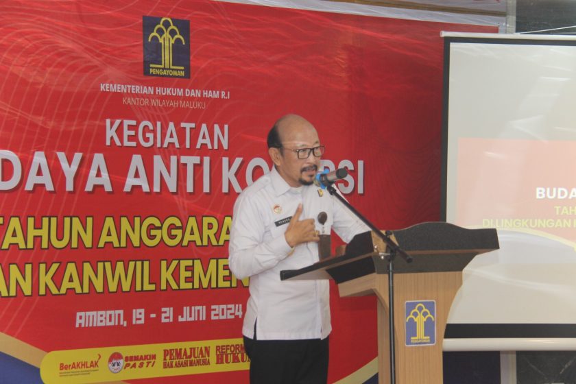 Ambon, indonesiatimur.co – Teguhkan komitmen dalam membangun Zona Integritas dan mewujudkan pelayanan publik yang prima, Kanwil Kemenkumham Maluku menggelar kegiatan Penguatan Budaya Anti Korupsi di Hotel Golden Palace Ambon, Rabu (19/06/2024) diikuti oleh Kepala Unit Pelaksana Teknis (UPT) dan Pejabat Administrator dan Pengawas pada Kantor Wilayah.