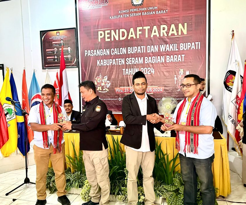 Piru, indonesiatimur.co – Sesuai tahapan dan jadwal Pilkada serentak tahun 2024, dimana pendaftaran bakal calon kepala daerah dari 27-29 Agustus, maka di hari kedua, pasangan bakal calon Bupati dan wakil Bupati M.Hatta Hehanussa dan Stanley Salenussa atau yang dikenal dengan jargon HATI, resmi mendaftar di Komisi Pemilihan Umum (KPU) Kabupaten Seram Bagian Barat (SBB), Rabu (28/08/2024).