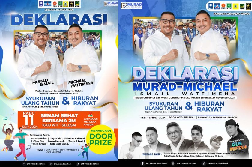 “Selain itu bukan hanya deklarasi bakal paslon gubernur dan wagub, tetapi dirangkaikan dengan pelaksanaan senam sehat bersama 2M yang akan dimulai sejak pukul 16.00 WIT dan dilanjutkan deklarasi serta syukuran HUT Pak Murad Ismail yang akan dirangkai dalam hiburan rakyat oleh artis nasional dan artis lokal diantaranya, Pasya Ungu, Doddie L, Freshly N, Igo Idol, Ebeng Acom, Gaya Ode, Nanala Voice, MI Band, Rahman Kalderak, dan artis kota Ambon lainnya. Acara ini terbuka untuk semua masyarakat,”jelas Widya.