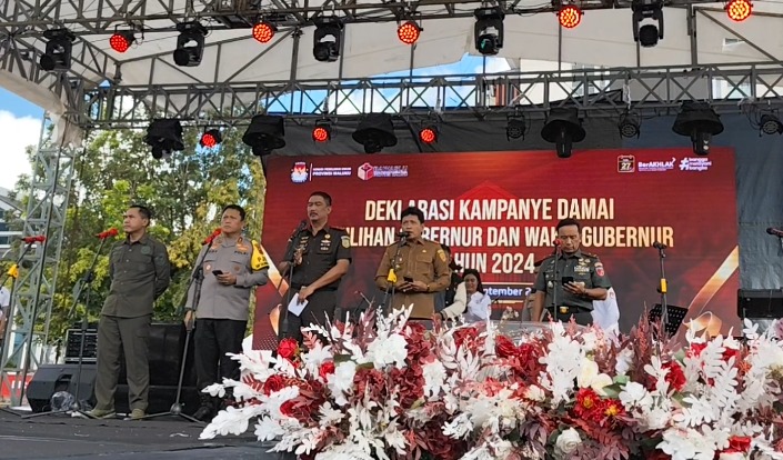 Ambon, indonesiatimur.co – Penjabat Gubernur Maluku Sadali Ie, hadiri Deklarasi Kampanye Damai Pemilihan Gubernur dan Wakil Gubernur Provinsi Maluku Tahun 2024, yang diselenggarakan oleh Komisi Pemilihan Umum (KPU) Provinsi Maluku dan Badan Pengawas Pemilihan Umum (Bawaslu) Provinsi Maluku, pada Selasa (24/09/2024), di Lapangan Merdeka Ambon.