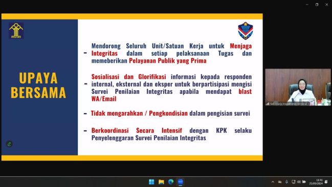 Dalam paparannya, ia mengungkapkan bahwa tujuan pelaksanaan survei ini adalah untuk memetakan risiko korupsi serta menilai kemajuan upaya pencegahan korupsi yang dilakukan oleh Kementerian/Lembaga/Pemerintah Daerah (KLPD). Beliau juga menegaskan pentingnya SPI dalam mengidentifikasi area prioritas yang rentan terhadap korupsi, sehingga dapat menjadi dasar dalam merumuskan perbaikan program pencegahan korupsi di lingkungan Kemenkumham.