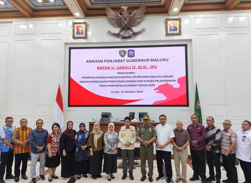 Ambon, indonesiatimur.co – Penjabat Gubernur Maluku Sadali Ie, memberikan arahannya, pada acara Pembekalan Bagi Anggota Satuan Polisi Pamong Praja (Satpol-PP) Provinsi Maluku dalam rangka Penegakan Peraturan Daerah dan Sukses Pelaksanaan Pemilihan Kepala Daerah, pada Jumat (11/10/2024), bertempat di Aula Lantai 7 Kantor Gubernur Maluku.
