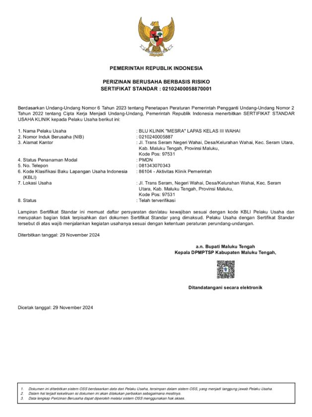 Dengan Perizinan Berusaha Berbasis Risiko Sertifikasi Standar nomor 02102400058870001, Tersih menyampaikan bahwa sertifikasi ijin operasional klinik yang diperoleh tersebut merupakan komitmen jajarannya untuk meningkatkan kualitas pelayanan kesehatan bagi warga binaan Lapas Wahai.
