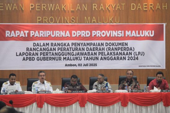 Ambon, indonesiatimur.co – Gubernur Maluku Hendrik Lewerissa menyampaikan Dokumen Rancangan Peraturan Daerah (RANPERDA) Laporan Pertanggungjawaban (LPJ) Pelaksanaan APBD Gubernur Maluku Tahun Anggaran 2024, kepada Ketua Dewan Perwakilan Rakyat Daerah Provinsi Maluku Benhur G. Watubun, dalam Rapat Paripurna di Kantor DPRD Provinsi Maluku, Rabu (02/07/2025).