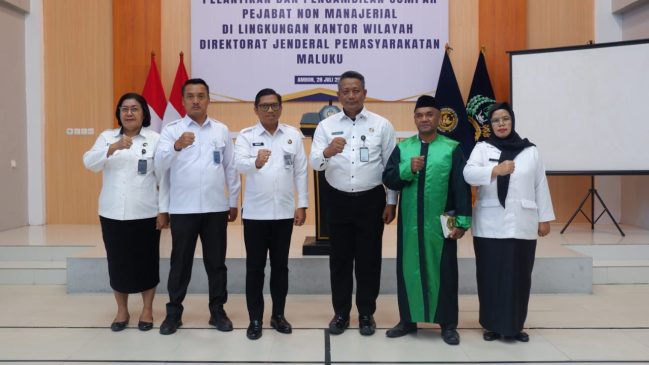 Ambon, indonesiatimur.co – Dalam memastikan bahwa organisasi dapat memenuhi kebutuhan dan tantangan yang ada sesuai dengan peraturan yang berlaku, Kantor Wilayah (Kanwil) Direktorat Jenderal Pemasyarakatan (Ditjenpas) Maluku menggelar pelantikan dan pengambilan sumpah jabatan fungsional non manajerial Jabatan Fungsional Tertentu (JFT) Pembina Keamanan Pemasyarakatan, Senin (28/07/2024).