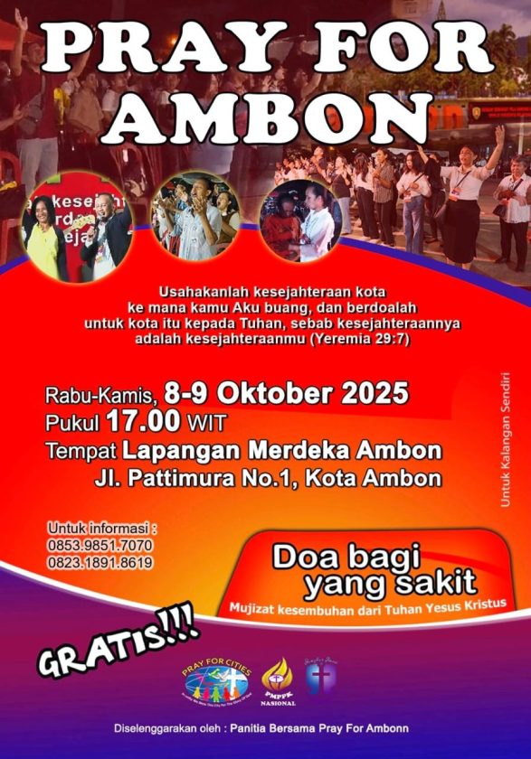 Ambon, indonesiatimur.co – Sebagai wujud kerinduan untuk melihat kota Ambon hidup dalam damai sejahtera, akan digelar Kegiatan Pray For Ambon pada 8–9 Oktober 2025 pukul 17.00 WIT di Lapangan Merdeka Ambon.