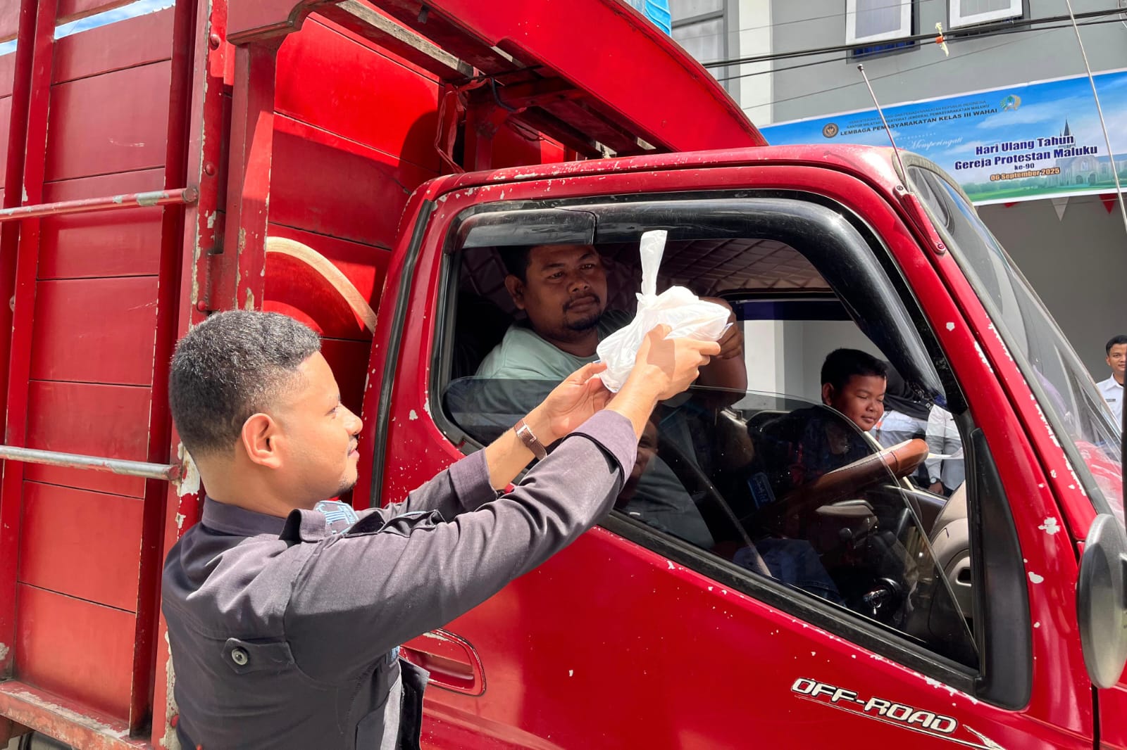 Adapun dalam pelaksanaan baksos tersebut, masyarakat yang melintas diberikan sekotak snack sebagai bentuk tanda kasih dan selebaran capaian program pembinaan Lapas Wahai sebagai bentuk promosi.