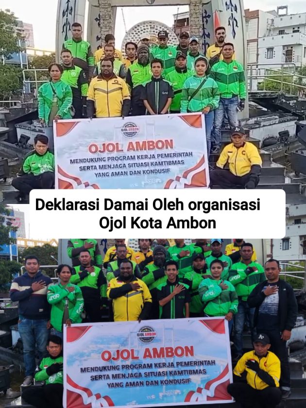 Ambon, indonesiatimur.co – Untuk mendukung program kerja pemerintah dan menjaga situasi kamtibmas yang aman dan kondusif, organisasi ojek online Kota Ambon melalukan deklarasi damai pada Kamis (16/10/2025) pukul 17.30 WIT, di gong perdamaian Kota Ambon.