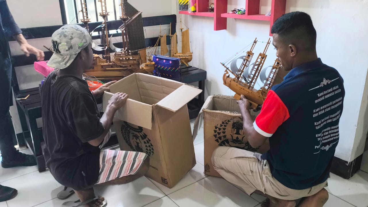 Wahai, indonesiatimur.co – Miniatur kapal pinisi, handbag rajutan dari plastik, dan pebble art hasil karya Warga Binaan Lembaga Pemasyarakatan (Lapas) Kelas III Wahai siap ramaikan pameran dalam rangka Hari Ulang Tahun (HUT) Kota Masohi ke-68 Tahun 2025. Persiapan pengepakan barang-barang hasil karya dilakukan tim Lapas di ruang galeri, Kamis (30/10/2025).