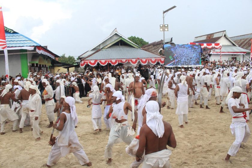 Pergelaran budaya Ma’atenu, yang juga menampilkan tarian tenun dan membawa bibit unggul sebagai bagian dari Budaya Matasiri, ditutup dengan puncak atraksi Cakalele massal di depan Masjid Pelauw pada sore hari. (it-02)