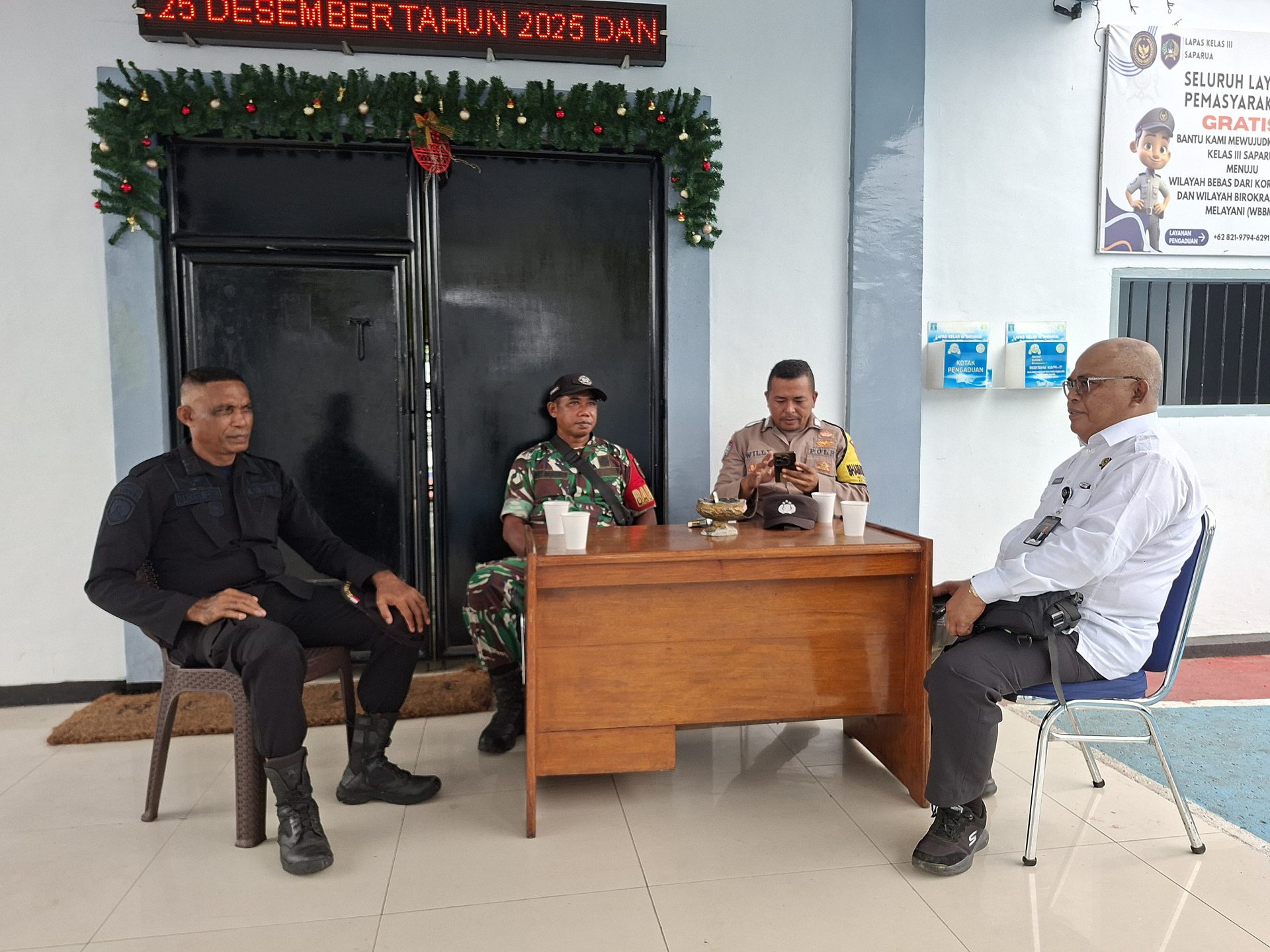 Saparua, indonesiatimur.co – Kanwil Ditjenpas Maluku, Lapas Kelas III Saparua melaksanakan kegiatan Pengamanan (PAM) Natal 2025 dan Tahun Baru 2026 Lintas Sektor guna memastikan situasi keamanan dan ketertiban tetap terjaga selama perayaan hari besar keagamaan dan pergantian tahun di Lapas saparua. Kegiatan PAM Nataru ini dilaksanakan mulai tanggal 24, 25 dan 26 Desember 2025 dilanjutkan pada tanggal 30, 31 Desember 2025 hingga 01 Januari 2026 dari pukul 08.00 WIT hingga pukul 18.00 WIT. Rabu (24/12/2025).