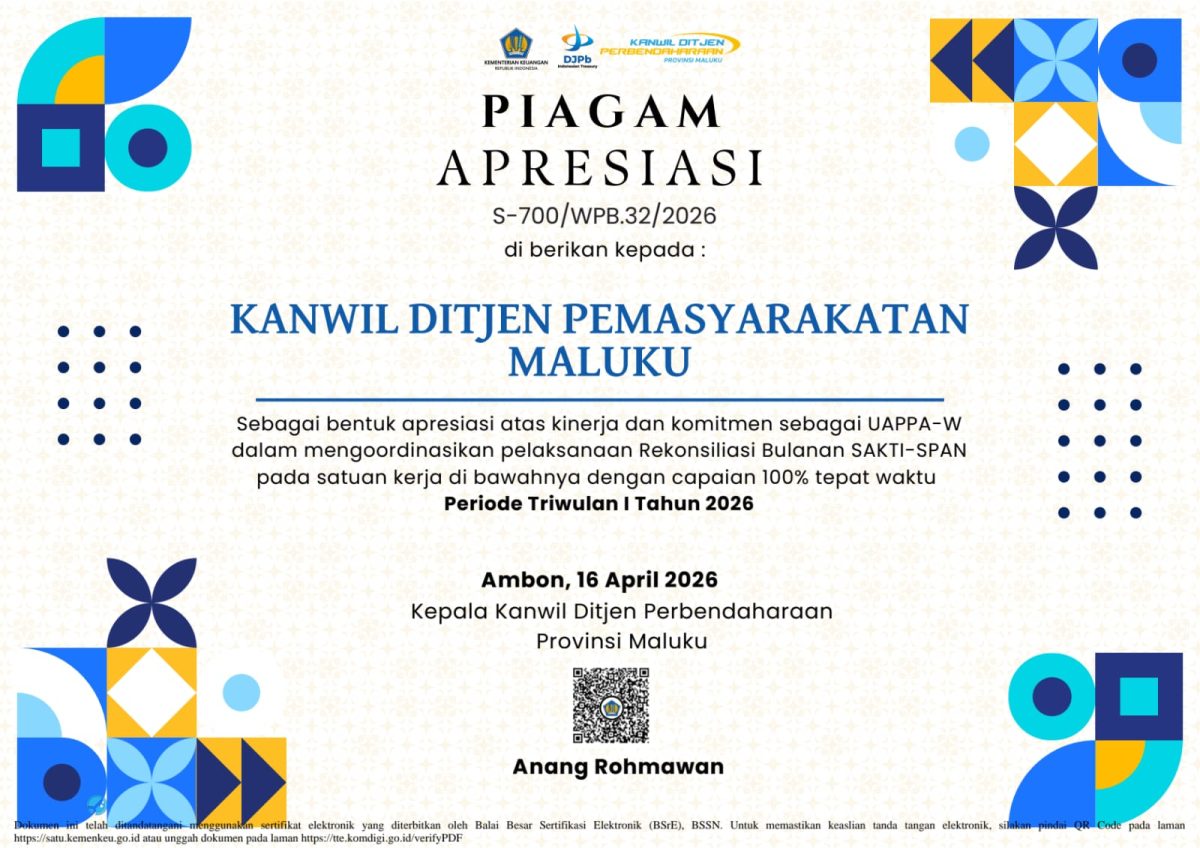 Piagam yang ditandatangani oleh Anang Rohmawan tersebut menjadi bukti nyata bahwa seluruh satuan kerja di bawah Kanwil PAS Maluku mampu melaksanakan rekonsiliasi bulanan SAKTI-SPAN secara tepat waktu dengan capaian 100 persen, terhitung sejak Januari hingga Maret 2026.