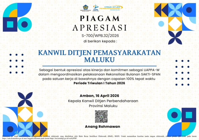 Piagam yang ditandatangani oleh Anang Rohmawan tersebut menjadi bukti nyata bahwa seluruh satuan kerja di bawah Kanwil PAS Maluku mampu melaksanakan rekonsiliasi bulanan SAKTI-SPAN secara tepat waktu dengan capaian 100 persen, terhitung sejak Januari hingga Maret 2026.